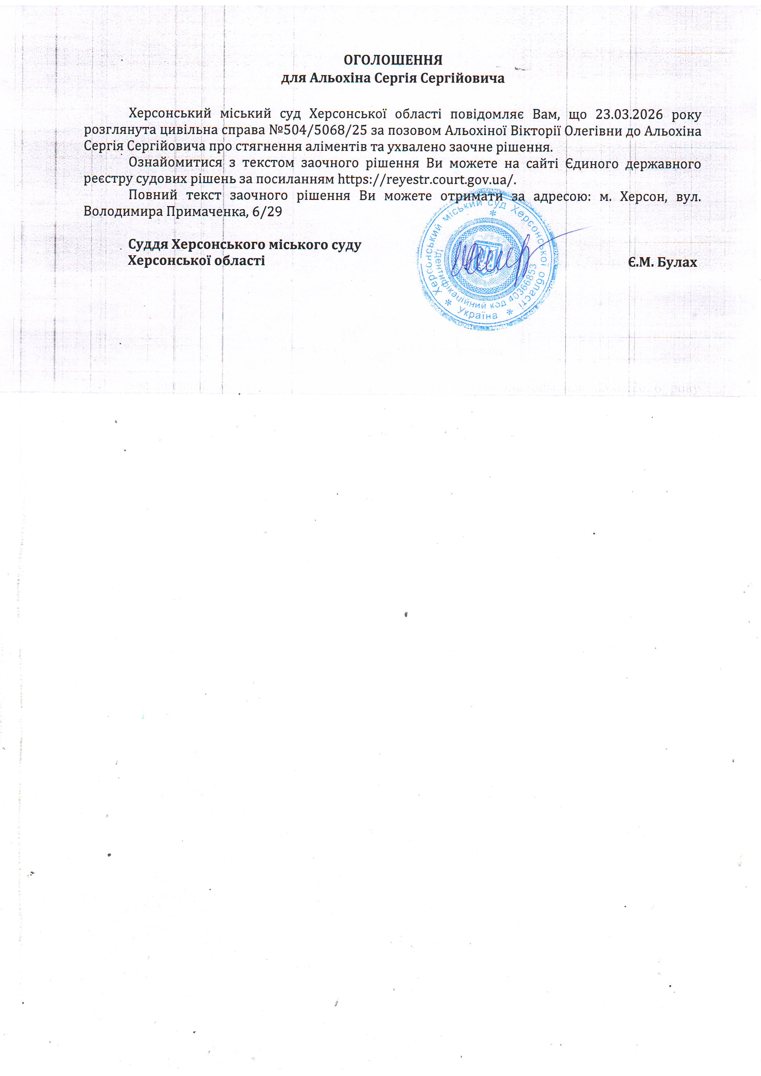 Оголошення для Альохіна Сергія Сергійовича про ухвалення заочного рішення