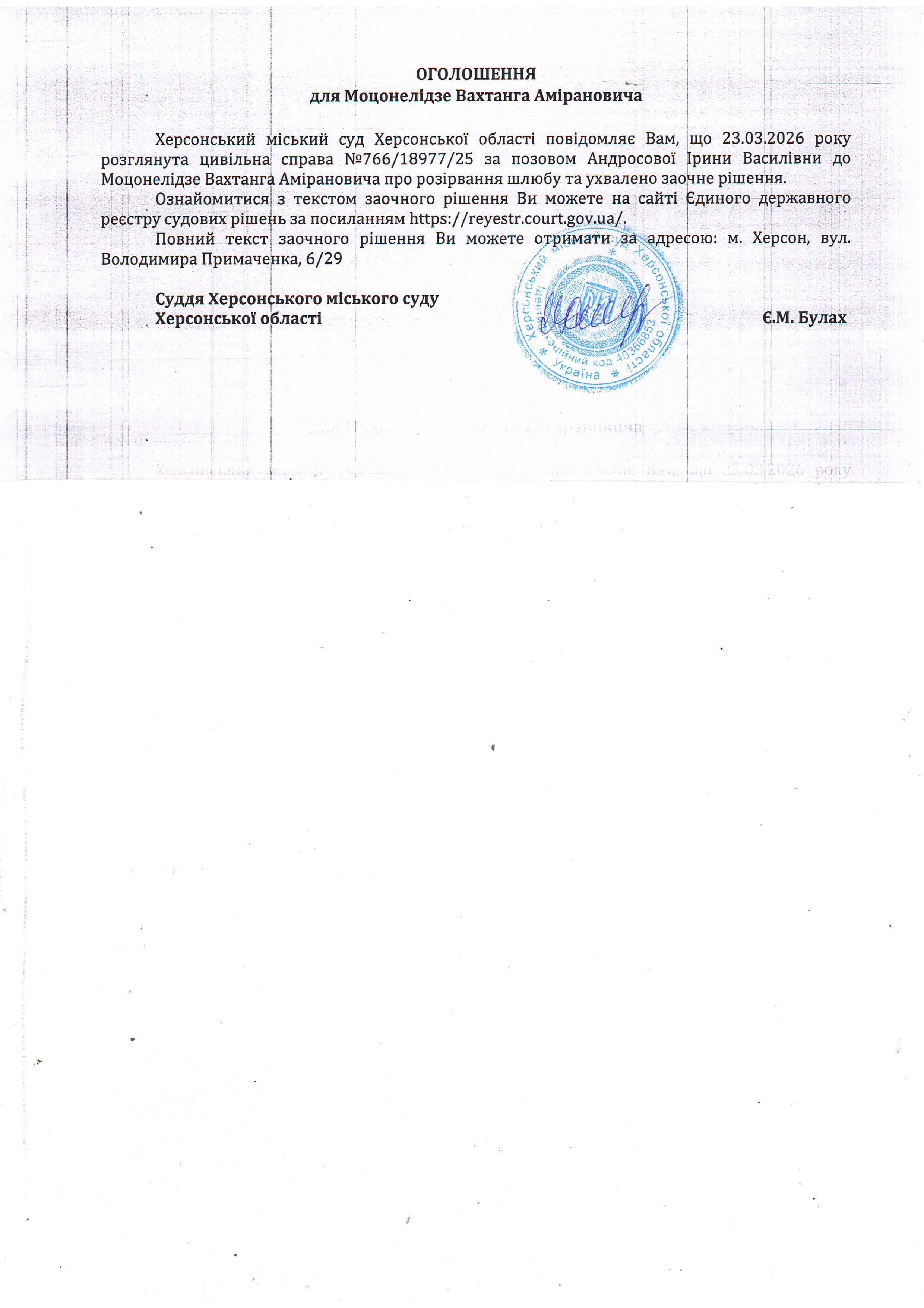 Оголошення для Моцонелідзе Вахтанга Амірановича про ухвалення заочного рішення