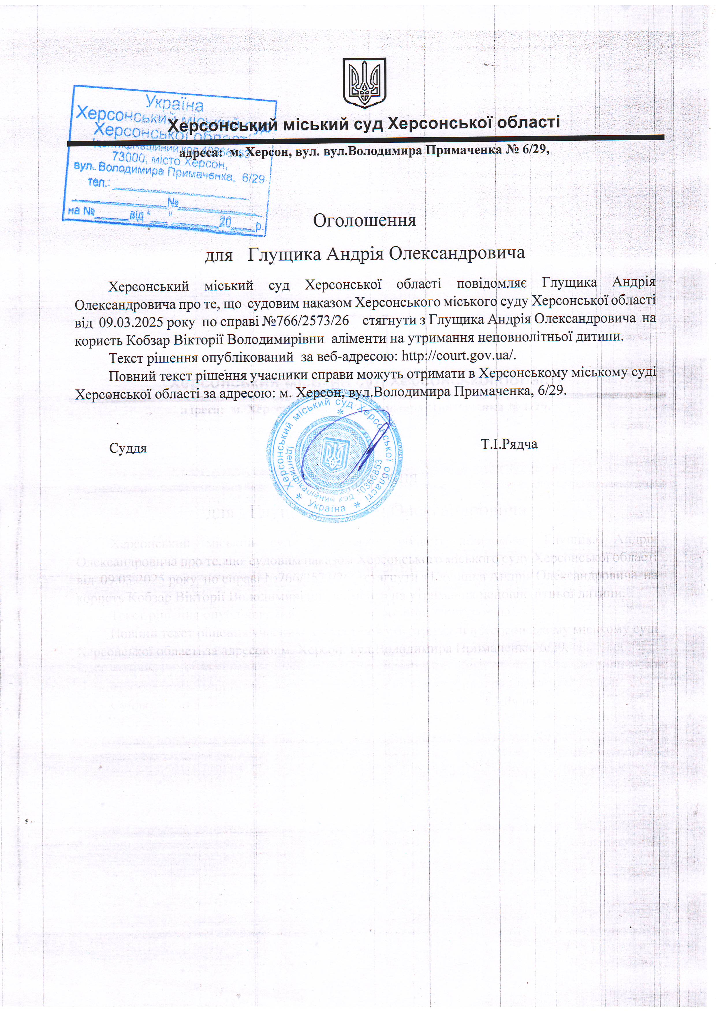 Оголошення для Глущика Андрія Олександровича