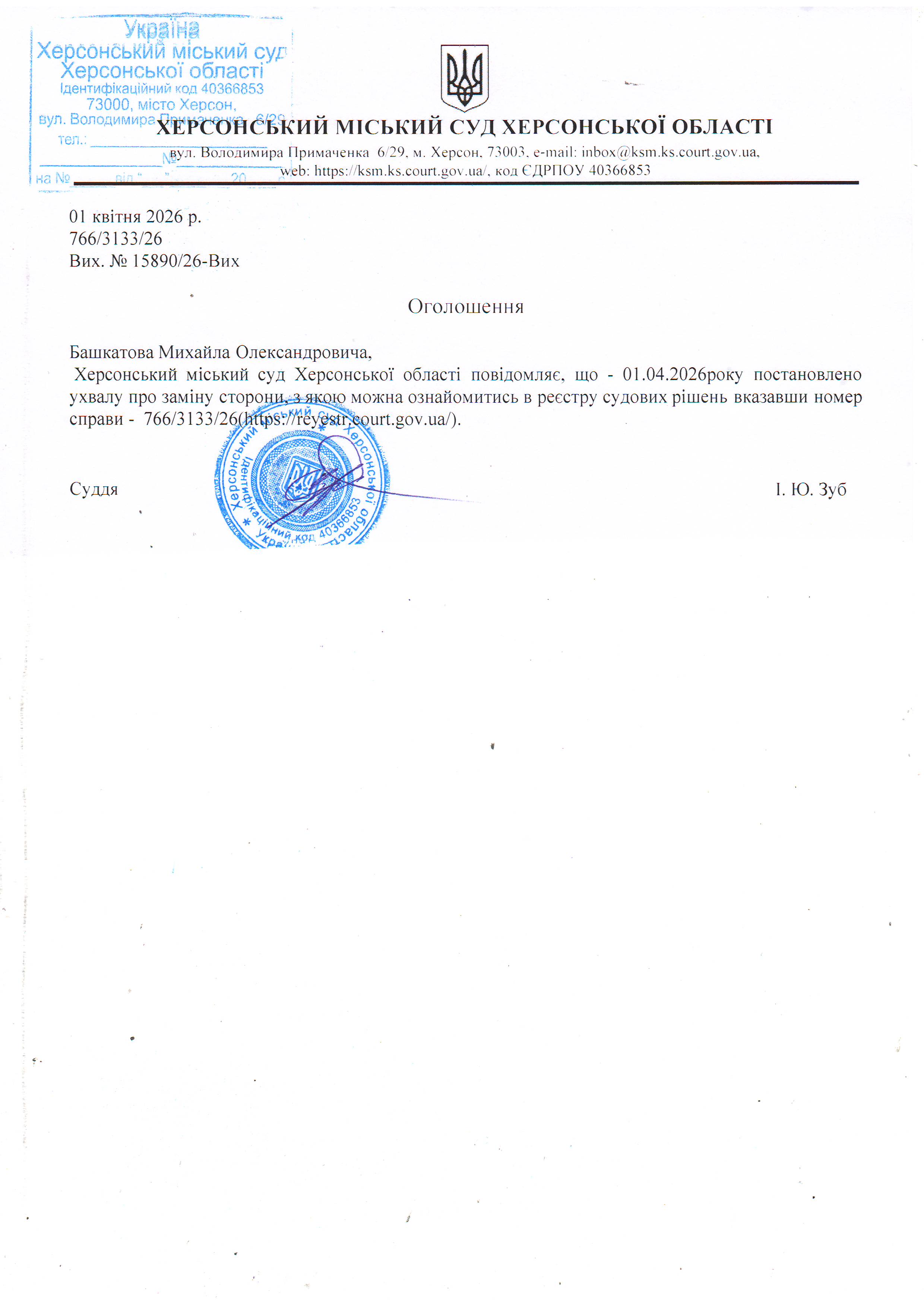 Оголошення для Башкатова Михайла Олександровича про постановалення ухвали
