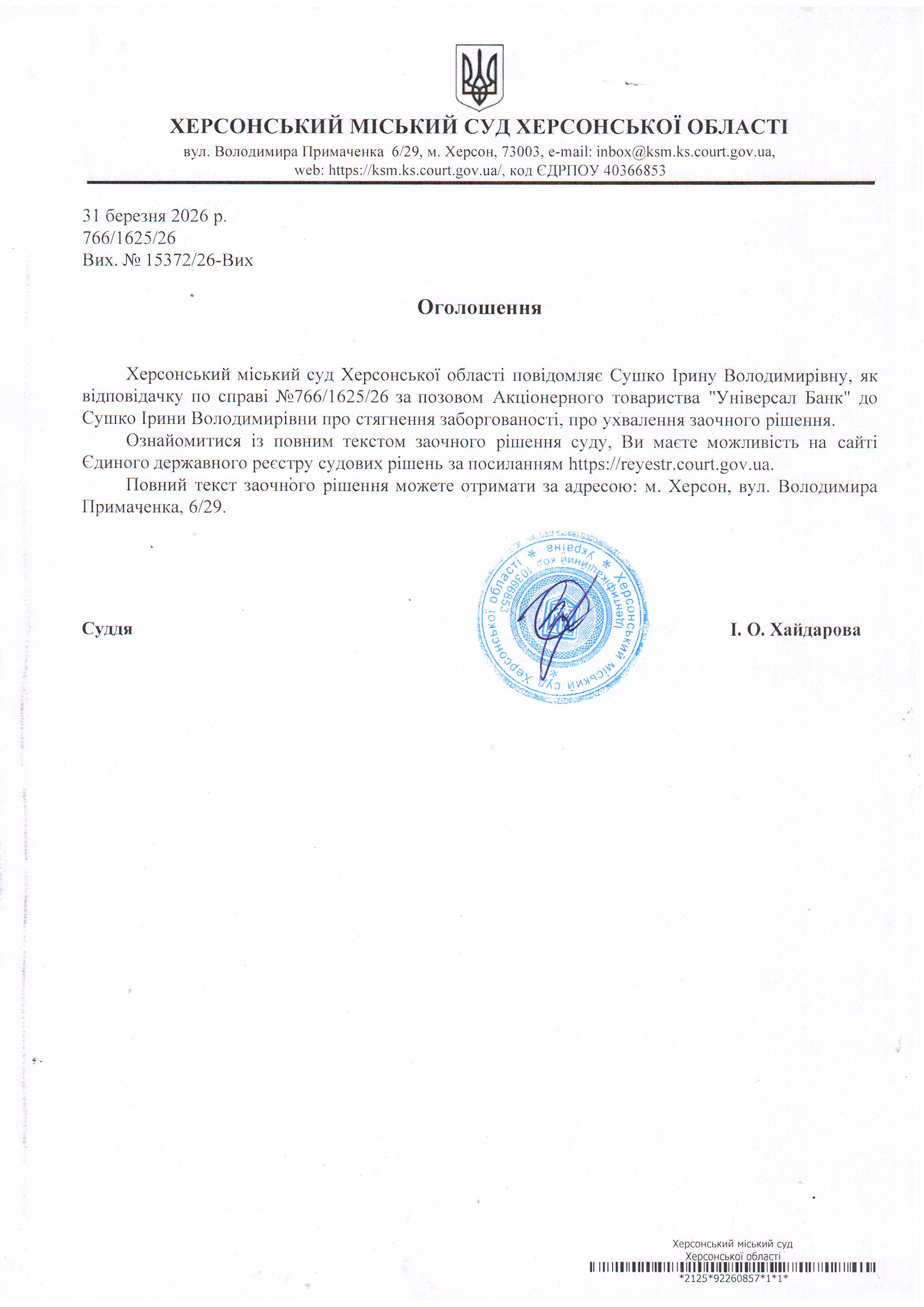 Оголошення для Сушко Ірини Костянтинівни про ухвалення заочного рішення