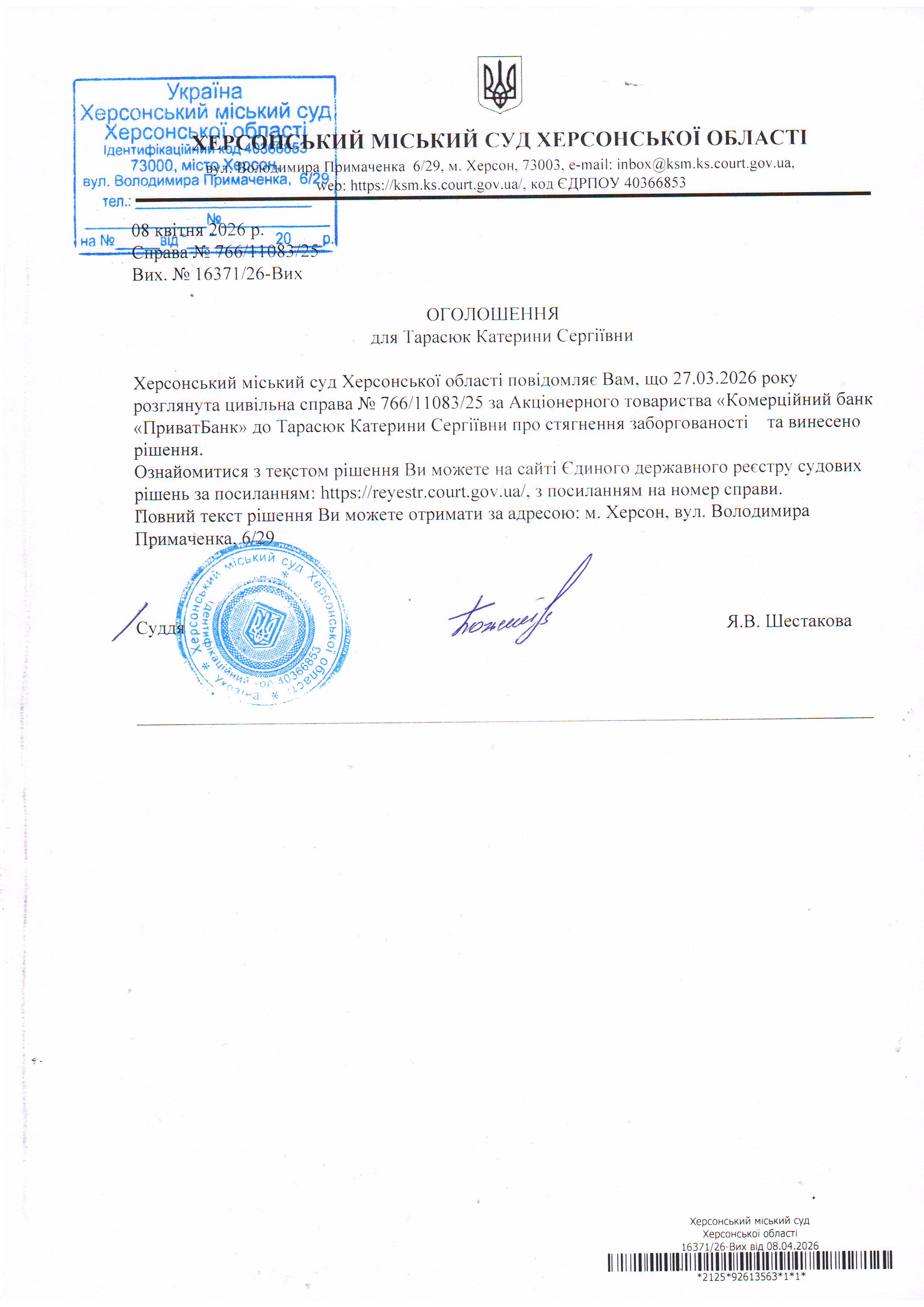 Оголошення для Тарасюк Катерини Сергіївни про винесення рішення