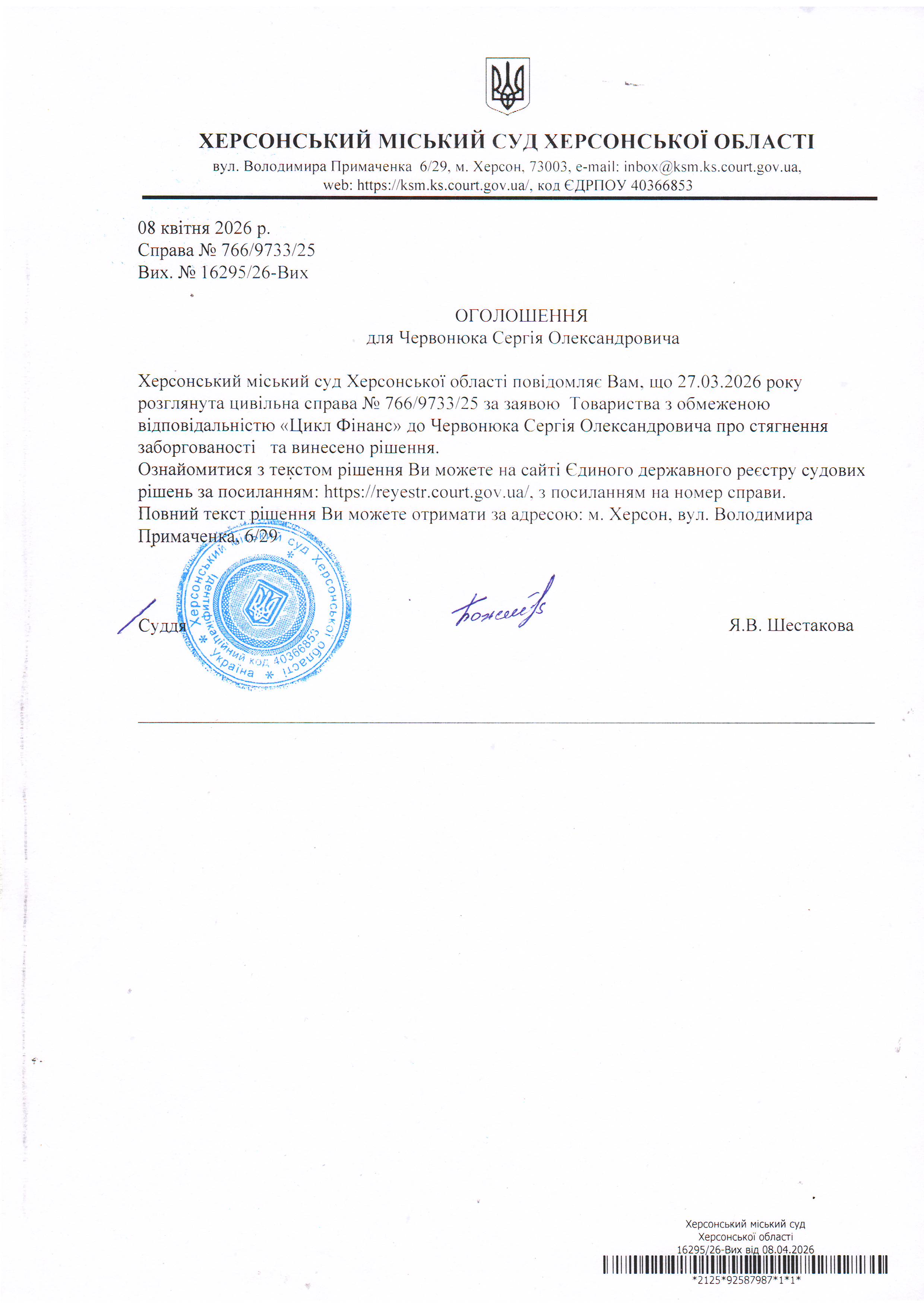 Оголошення для Червонюка Сергія Олександровича про винесення рішення
