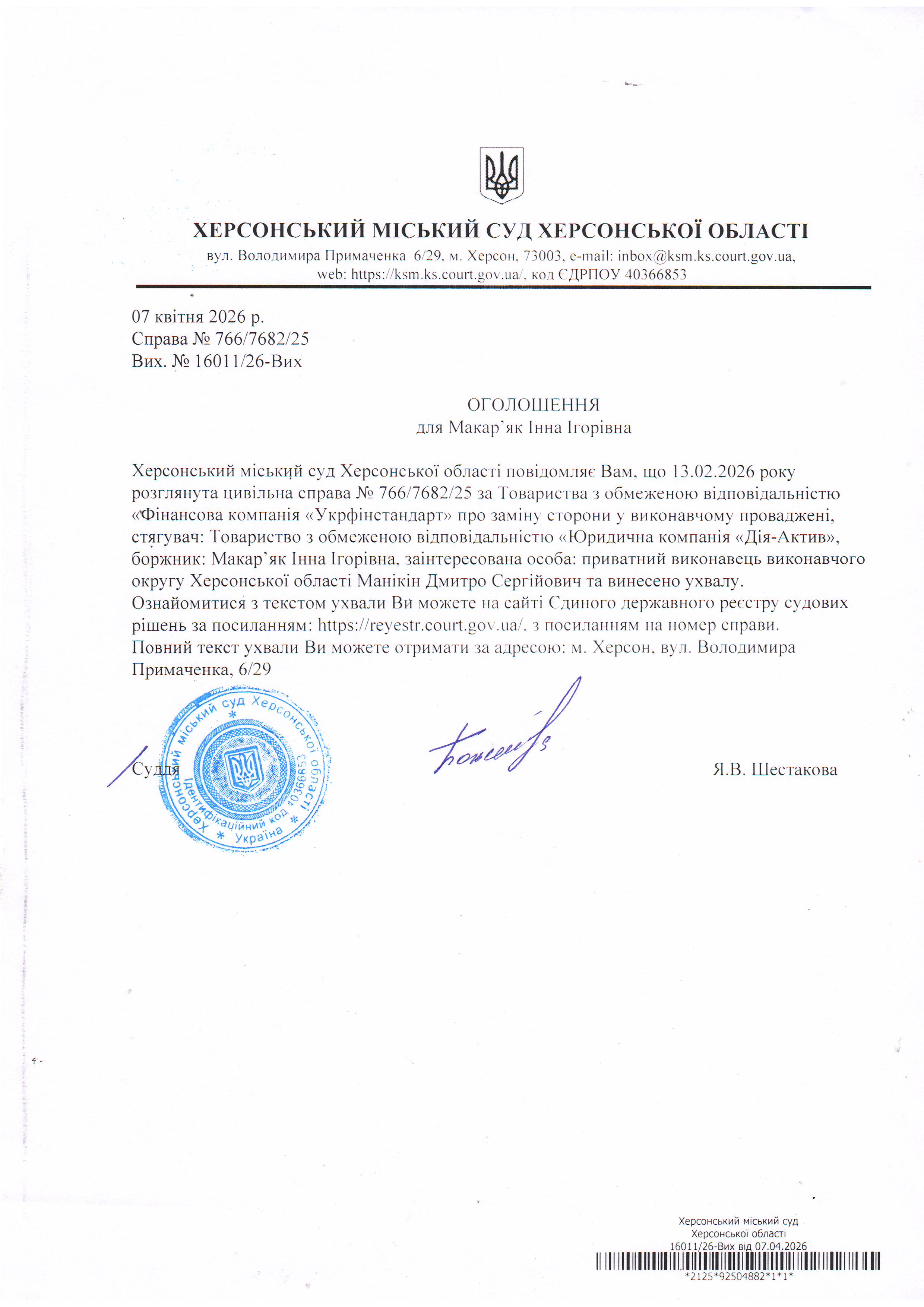 Оголошення для Макар'як Інни Ігорівни про винесення ухвали