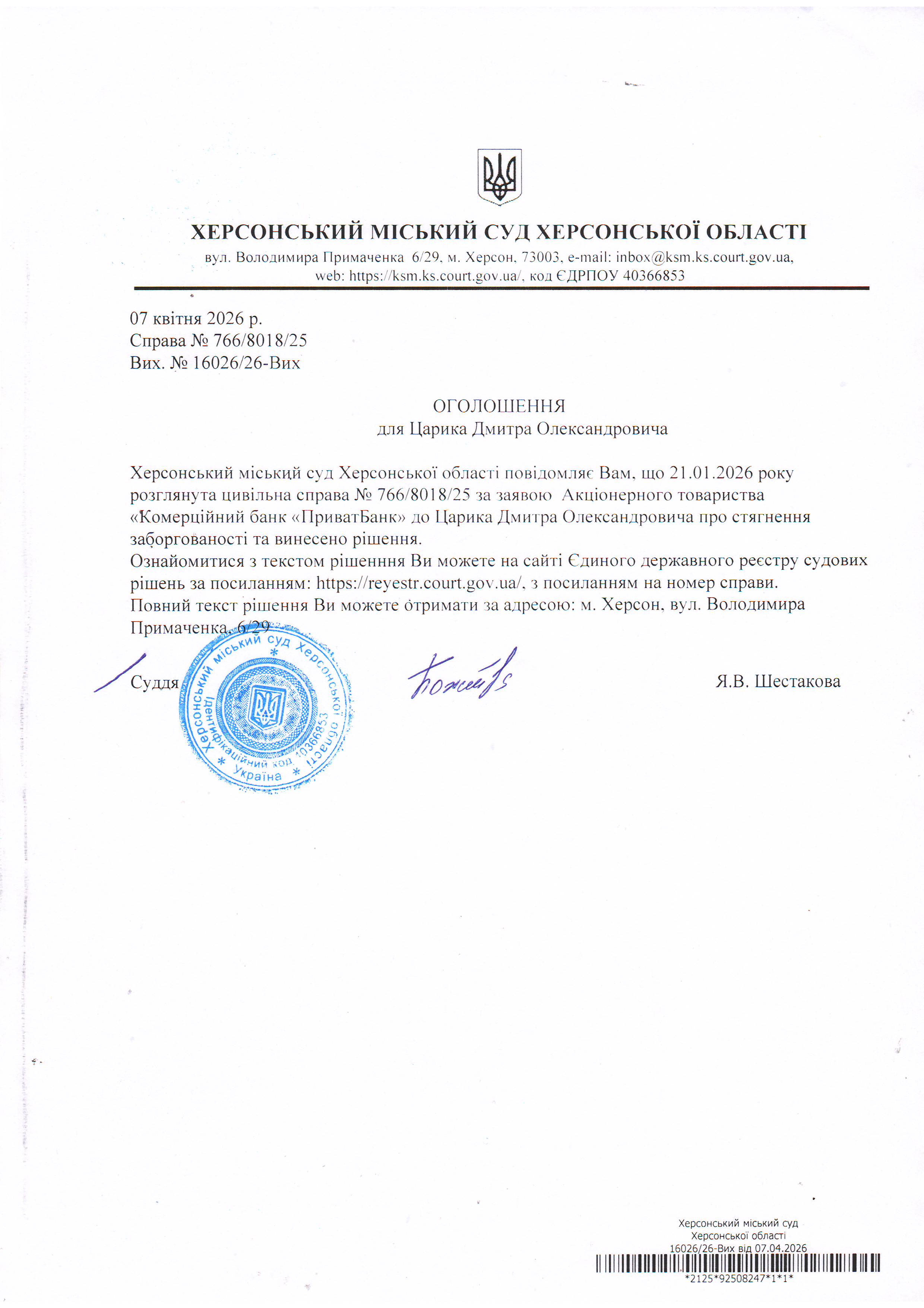 Оголошення для Царика Дмитра Олександровича про винесення рішення