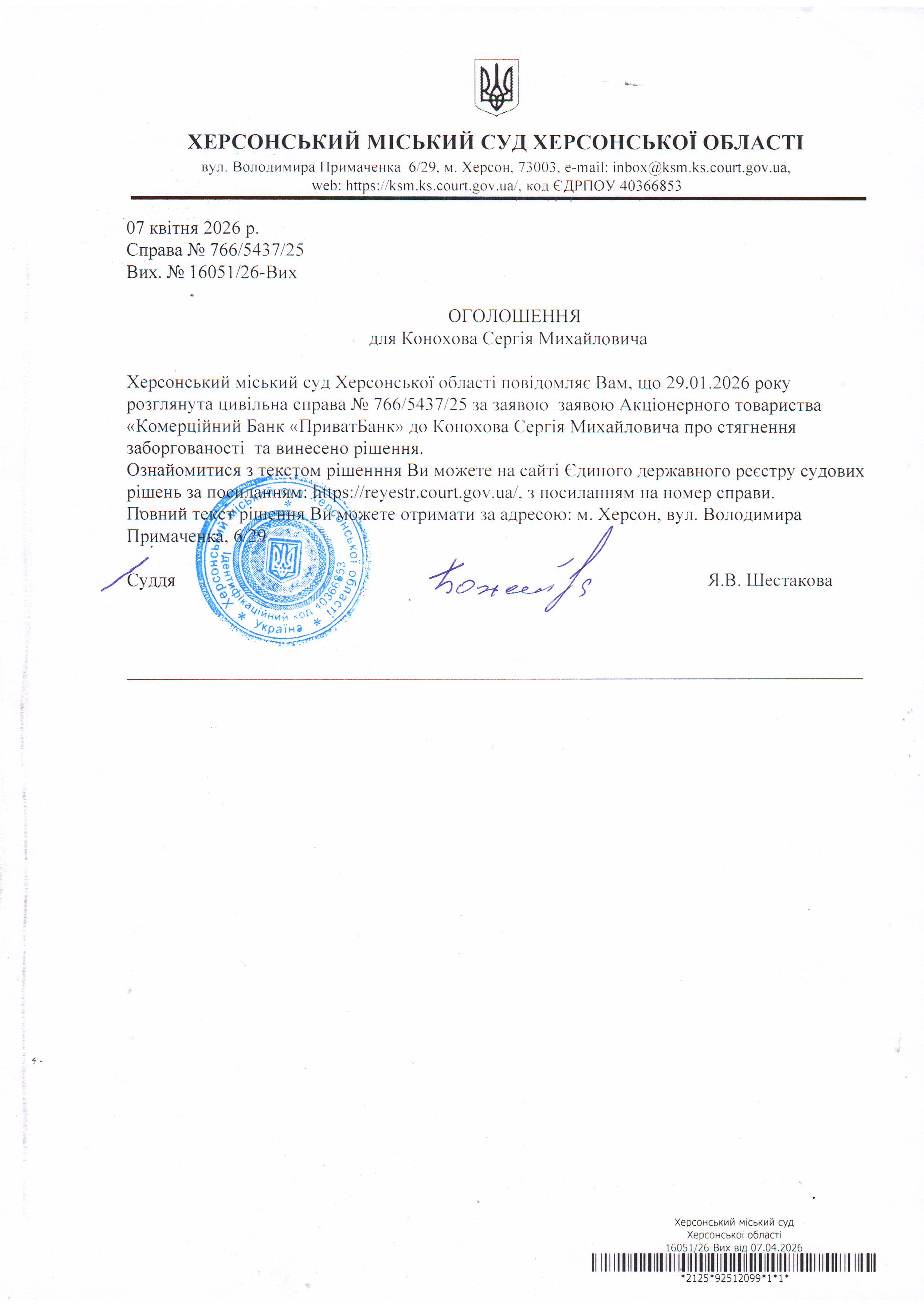 Оголошення для Конохова Сергія Михайловича про винесення рішення
