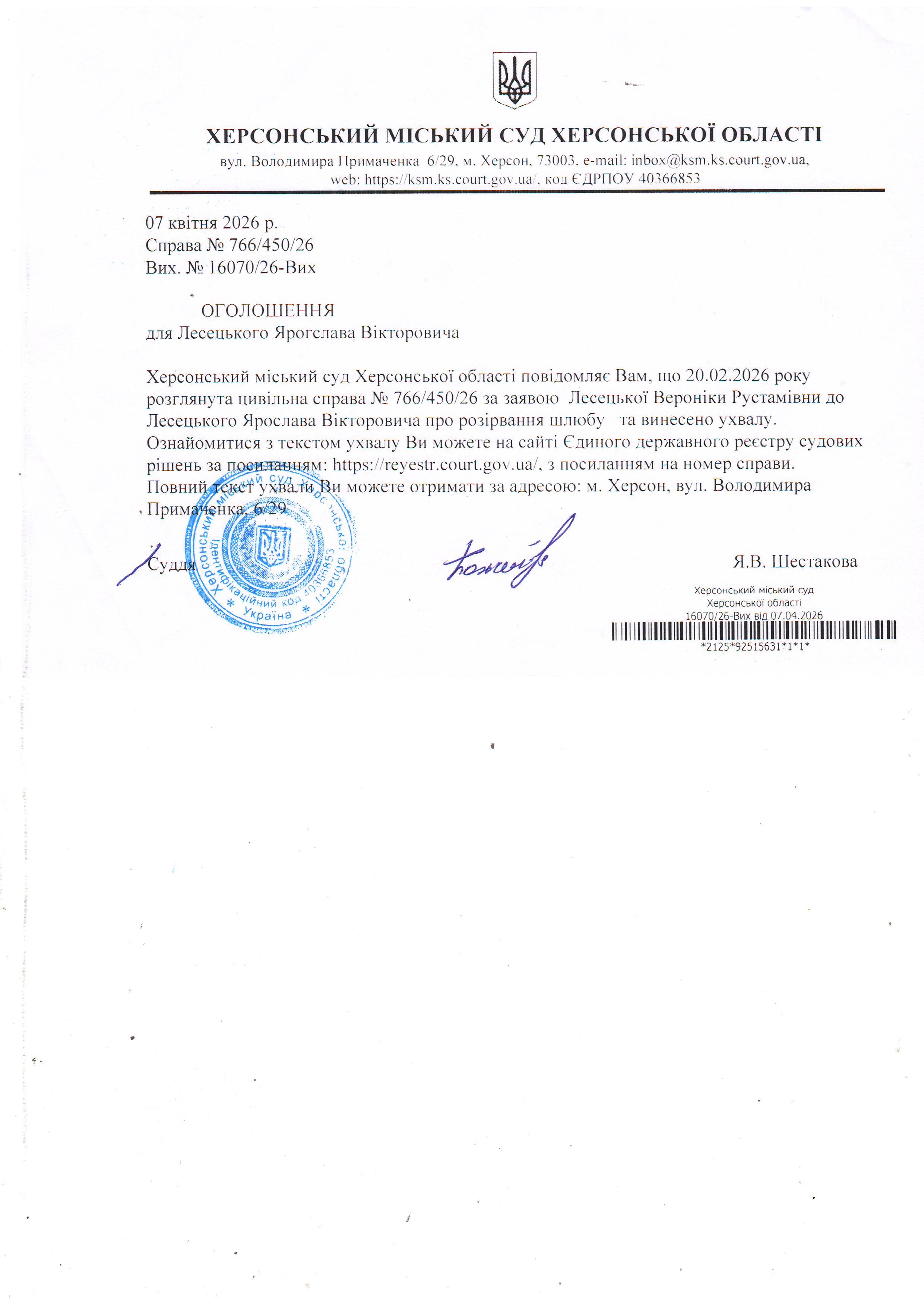Оголошення для Лесецького Ярослава Вікторовича про винесення ухвали