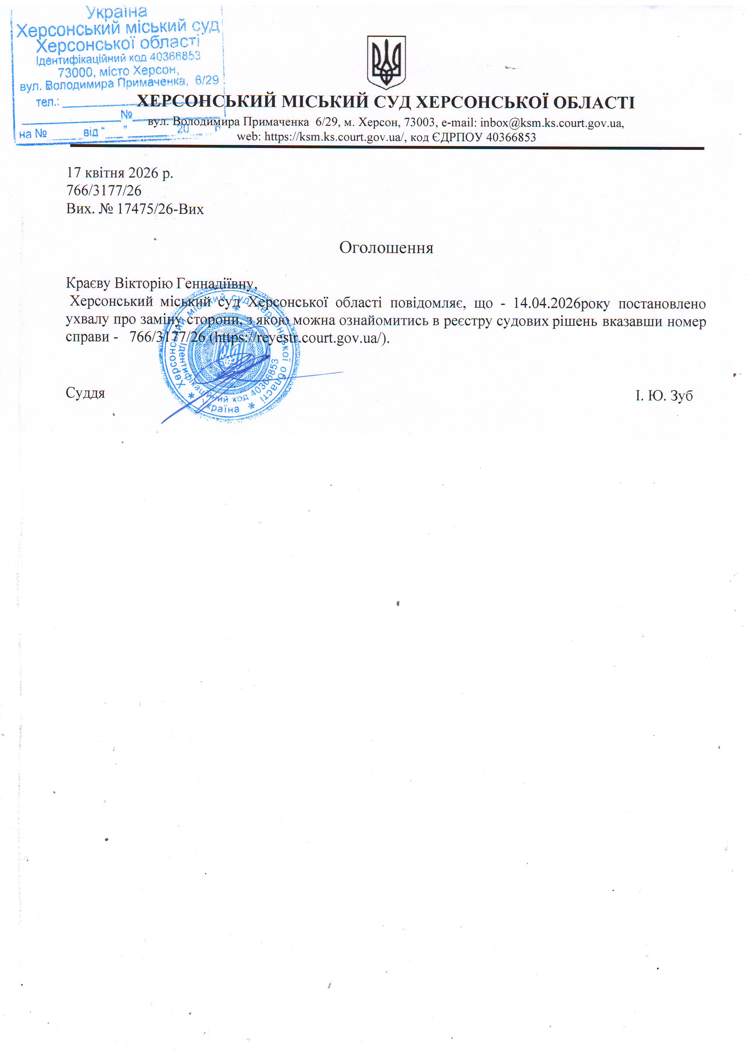 Оголошення для Краєвої Вікторії Геннадіївни про постановлення ухвали