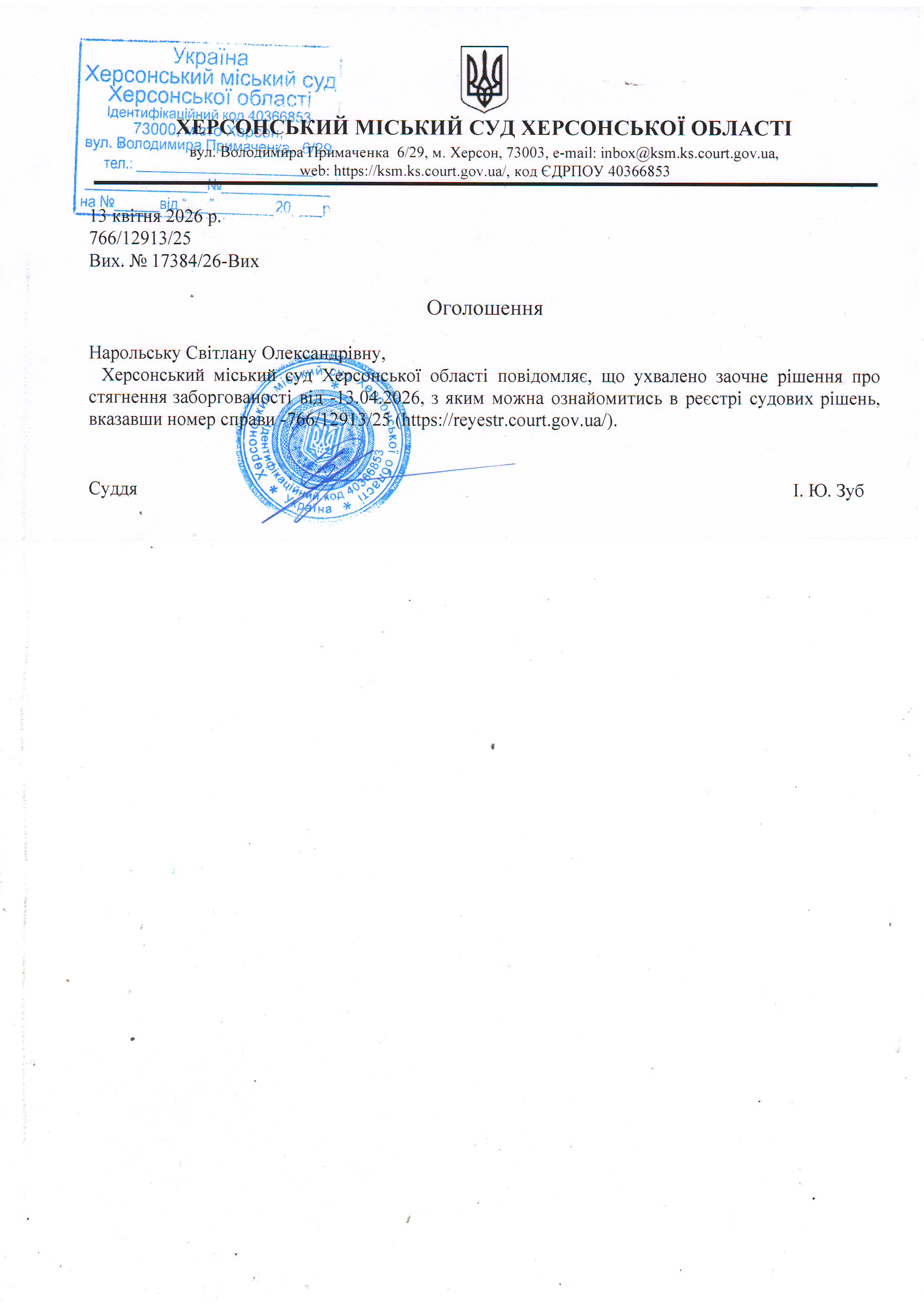 Оголошення для Нарольської Світлани Олександрівни про ухвалення заочного рішення