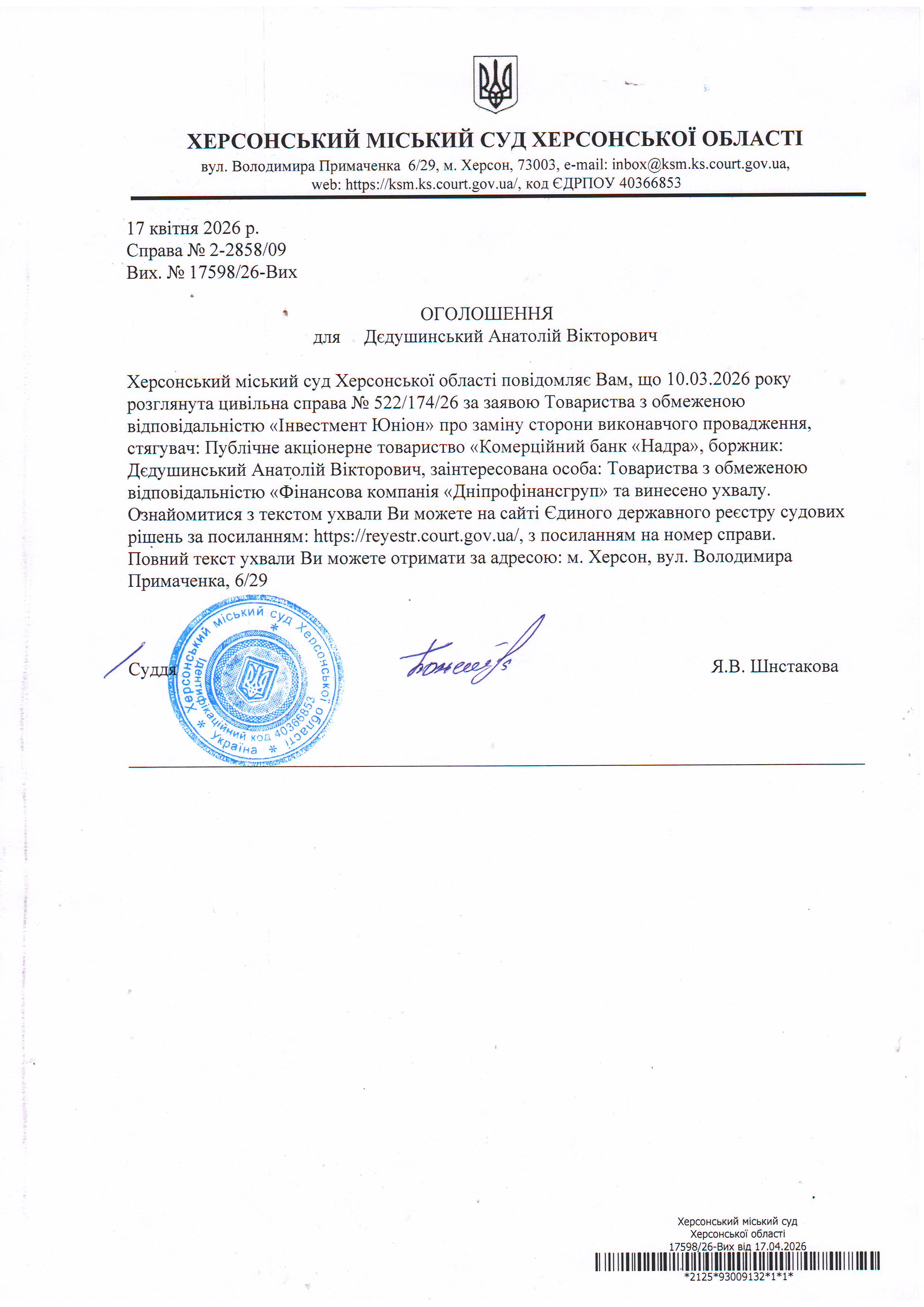 Оголошення для Дєдушинського Анатолія Вікторовича про винесення ухвали