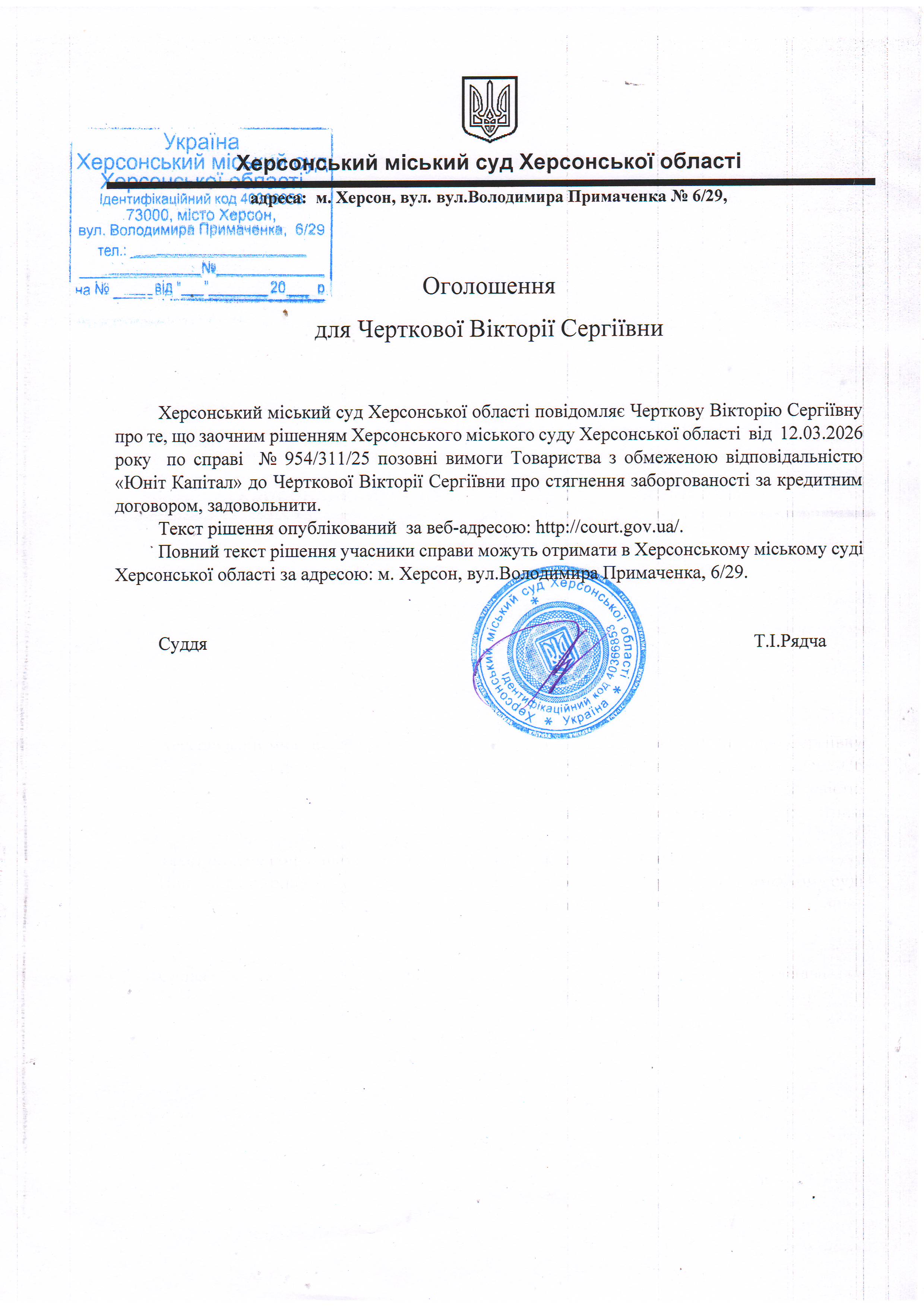 Оголошення для Черткової Вікторії Сергіївни