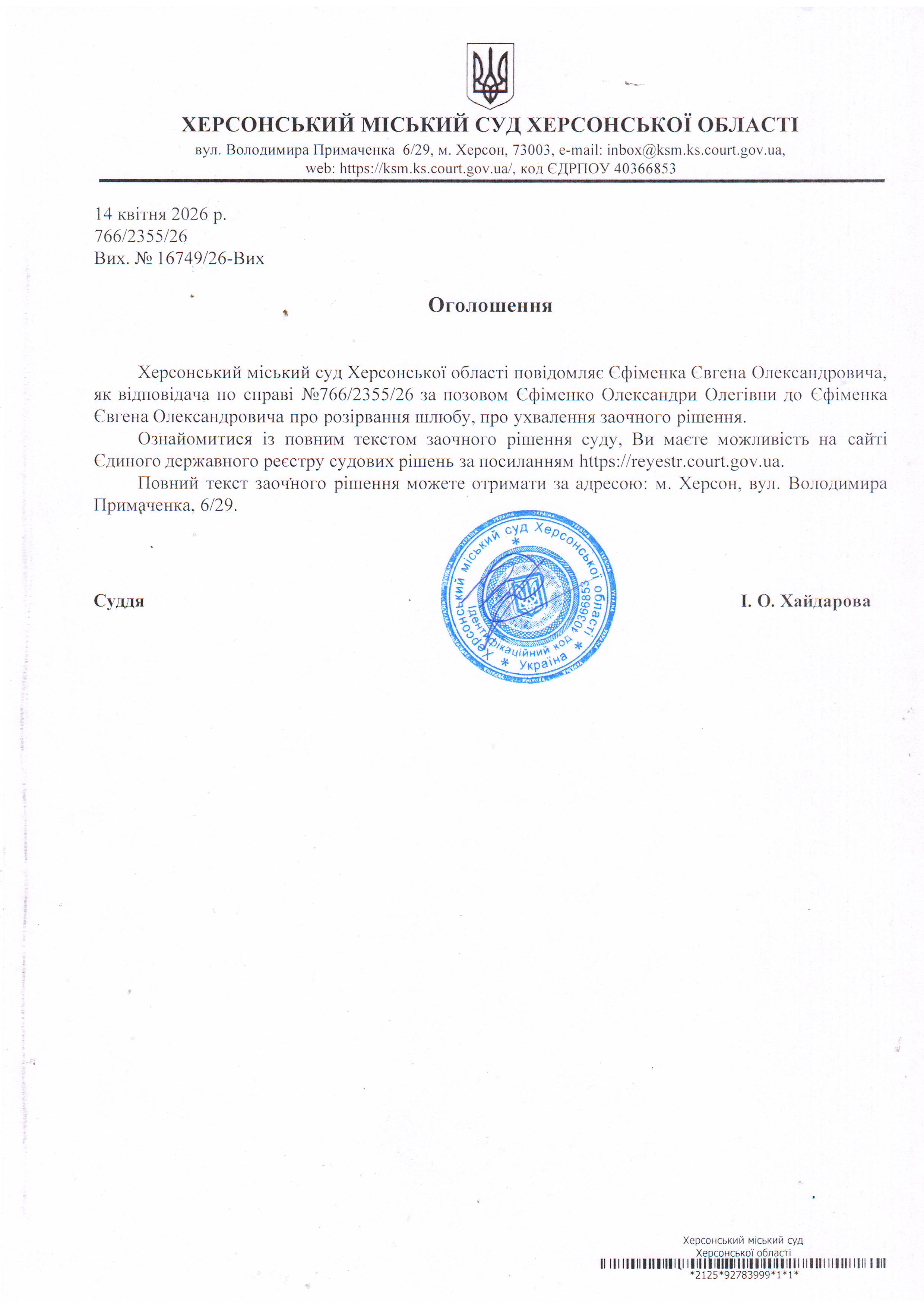 Оголошення для Єфіменка Євгена Олександровича про ухвалення заочного рішення